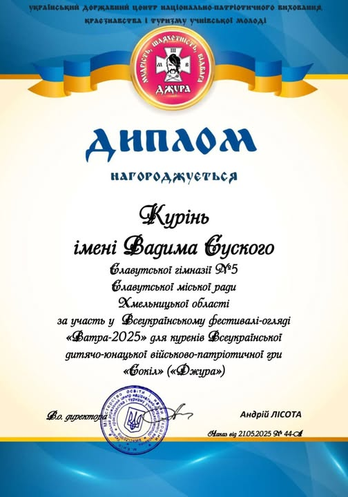 Всеукраїнський фестиваль «Ватра» у рамках заходів Всеукраїнської дитячо-юнацької військово-патріотичної гри «Сокіл» («Джура»). Курінь “Соколи” імені Вадима Суского Славутської гімназії №5
